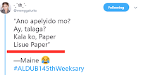 "Ano apelyido mo? Ay, talaga? Kala ko, Paper Lisue Paper" -Maine #ALDUB145thWeeksary"